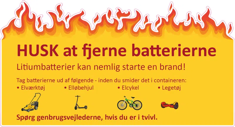 Generelt skal brugte batterier afleveres som farligt affald. Litiumbatterier – som findes i alt fra fjernbetjeninger til elcykler og mobiltelefoner – kan være meget brandfarlige, især hvis de er beskadigede, overophedes eller opbevares forkert. Du kan se på batteriet eller dets indpakning, om det indeholder litium.