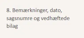 8 - Bemærkninger, dato, sagsnumre og vedhæftede bilag