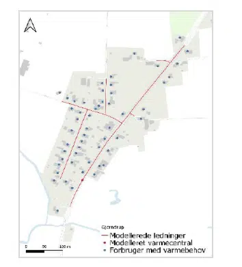Priserne indikerer de årlige varmeomkostninger for et gennemsnitshus (opvarmet areal og årligt varmebehov) i området markeret på kortet. Områdeafgrænsningen tager udgangspunkt i, at der maksimalt må være 100 meter mellem de opvarmede bygninger. Opvarmningsformen baserer sig på energioplysningerne fra BBR, som ikke altid stemmer overens med de faktiske forhold. Alle beregningerne er udført som screeninger, hvor der så vidt muligt er forsøgt at tage højde for lokale forhold. Længden og dimensioner på ledningsnettet per bygning har stor betydning for rentabiliteten i fælles varmeløsninger som f.eks. fjernvarme. Ledningsnettet er hydraulisk dimensioneret for Gjerndrup for at få så godt et datagrundlag som muligt. Dimensioneringen kan ikke anvendes direkte til gennemførelse af projektet, men bør optimeres og kalibreres forinden.