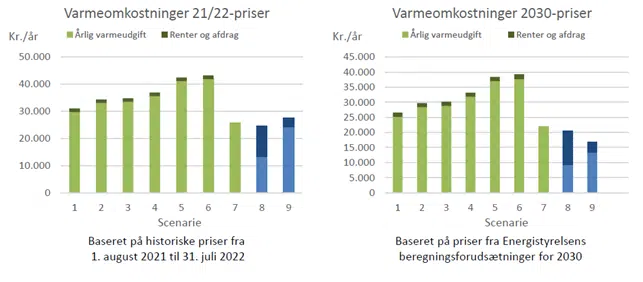 De fælles varmeløsninger er sammenholdt med de individuelle varmeløsninger, som vurderes at være de mest oplagte alternativer. Bemærk, at der for varmepumpen er forudsat en fremløbstemperatur på 55 °C. For fjernvarmeløsninger er der ikke taget stilling til takststruktur og tilslutningsomkostninger. Omkostninger til ledningsanlæg og produktionsanlæg er forudsat at være fælles og finansieret via KommuneKredit. Der er anvendt en rente på 2,5 % p.a. for lån til kollektive løsninger og 4,5 % på lån til individuelle løsninger. I beregningerne er der anvendt en løbetid svarende til forventet levetid, dog højst 30 år.