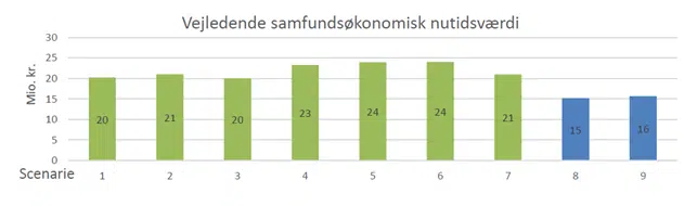 De vejledende samfundsøkonomiske beregninger forudsætter, at alle i området får en ny varmekilde i 2023. Beregnings-perioden er 2024-2043 og resultatet angives som nutidsværdi. For de scenarier, hvor løsningen ikke omfatter alle bygninger, f.eks. hvor kun 80 % tilsluttes fjernvarme, er det forudsat, at de resterende bygninger opvarmes med individuelle varmepumper. De vejledende samfundsøkonomiske beregninger er baseret på screeningerne, hvor bl.a. brændselsfordelingen er estimeret. Det skal bemærkes, at kommunen kun kan godkende projektet med de laveste samfundsøkonomiske omkostninger.