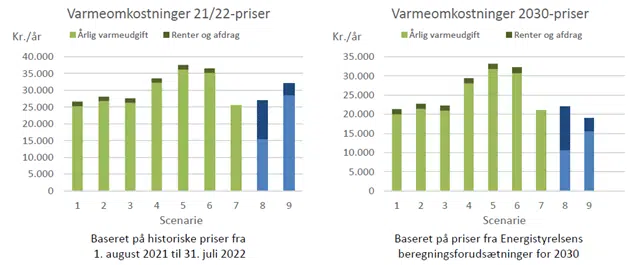 De fælles varmeløsninger er sammenholdt med de individuelle varmeløsninger, som vurderes at være de mest oplagte alternativer. Bemærk, at der for varmepumpen er forudsat en fremløbstemperatur på 55 °C. For fjernvarmeløsninger er der ikke taget stilling til takststruktur og tilslutningsomkostninger. Omkostninger til ledningsanlæg og produktionsanlæg er forudsat at være fælles og finansieret via KommuneKredit. Der er anvendt en rente på 2,5 % p.a. for lån til kollektive løsninger og 4,5 % på lån til individuelle løsninger. I beregningerne er der anvendt en løbetid svarende til forventet levetid, dog højst 30 år.