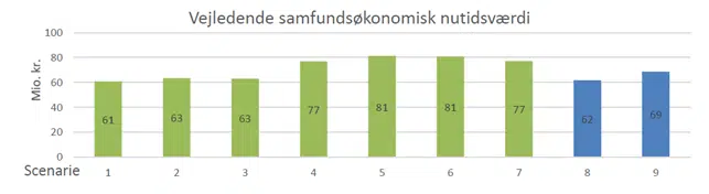 De vejledende samfundsøkonomiske beregninger forudsætter, at alle i området får en ny varmekilde i 2023. Beregningsperioden er 2024-2043 og resultatet angives som nutidsværdi. For de scenarier, hvor løsningen ikke omfatter alle bygninger, f.eks. hvor kun 80 % tilsluttes fjernvarme, er det forudsat, at de resterende bygninger opvarmes med individuelle varmepumper. De vejledende samfundsøkonomiske beregninger er baseret på screeningerne, hvor bl.a. brændselsfordelingen er estimeret. Det skal bemærkes, at kommunen kun kan godkende projektet med de laveste samfundsøkonomiske omkostninger.
