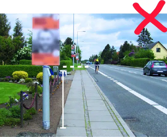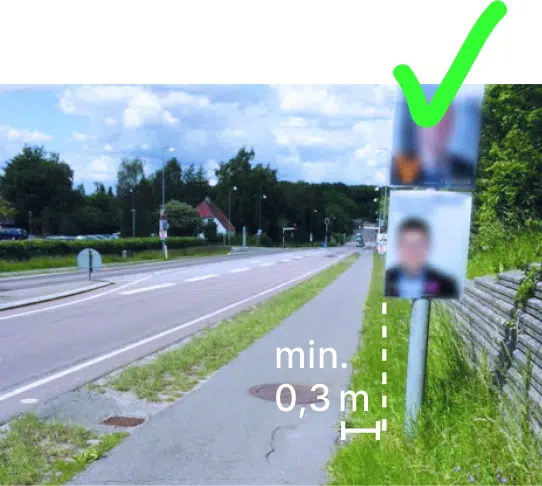 Lovligt opsatte plakater i rabat mellem cykelsti og vej, når afstand 0,3 m til cykelstikant og 0,5 m til vejkant er overholdt.