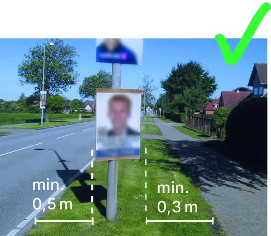 6) nærmere end 0,5 m fra kørebanekant eller 0,3 m fra cykelstikant målt fra nærmeste kant af valgplakaten,