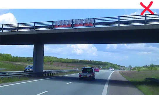 Ulovlig ophængning – ulovligt opsatte plakater på ydersiden af bro over skærende vej.
