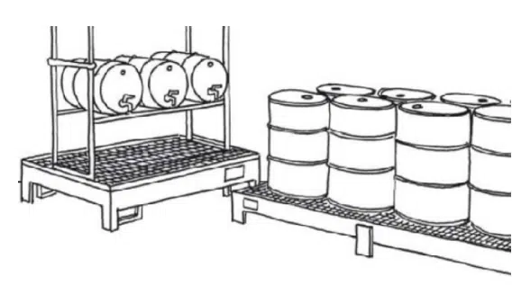 Figur 1: Tæt spildbakke i bestandigt materiale med stabil rist indrettet til tromler med eller uden stabilt stativ. Spildbakker står på tæt gulv uden afløb eller med tæt opkant omkring opbevaringsstedet.