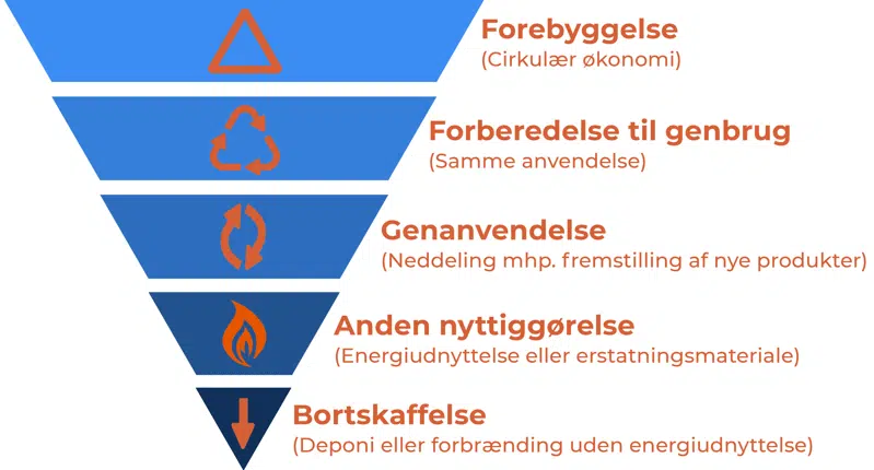 Affald er ofte en værdifuld ressource, overvej derfor om I kan klargøre affaldet til genbrug eller genanvendes. Hvis affaldet ikke kan det, går det nedad i hierarkiet til anden nyttiggørelse eller bortskaffelse.