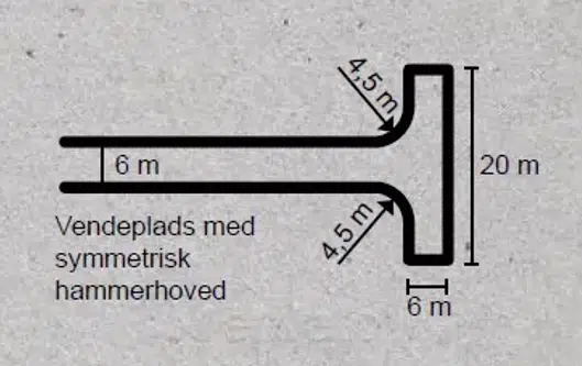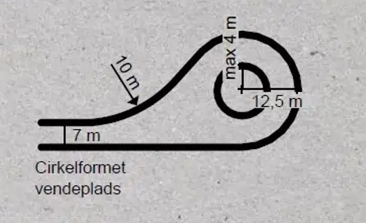 Ved en cirkelformet vendeplads skal der som minimum være 12,5 meter i ydre og 4 meter i indre radius (se tegninger herunder).