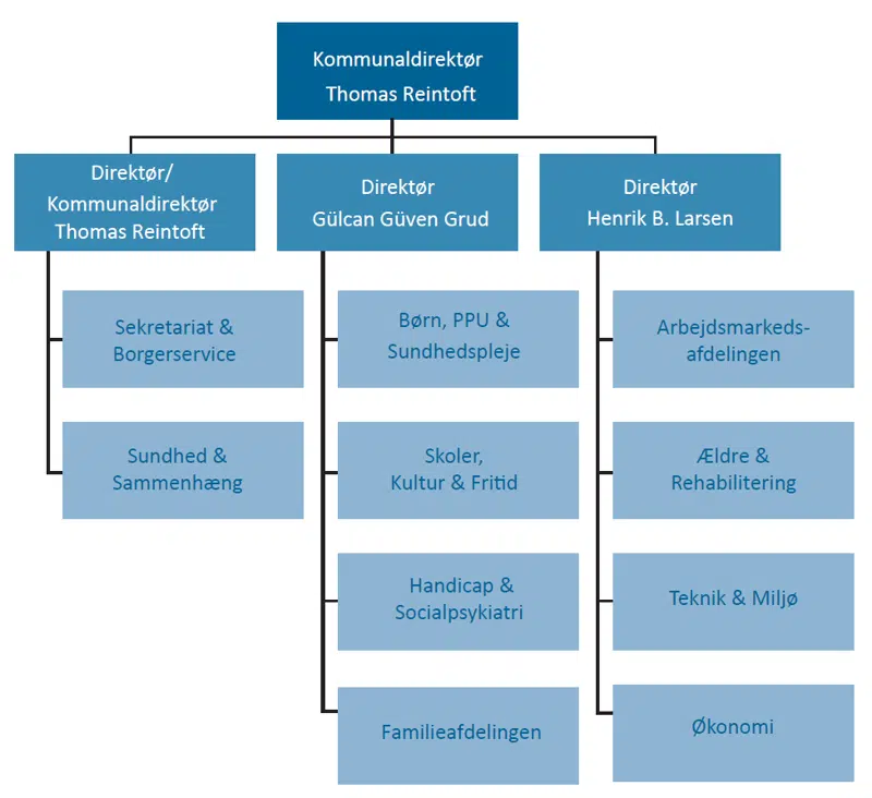 Under kommunaldirektør Thomas Reintoft er følgende afdelinger, stabsfunktioner og institutioner organiseret: